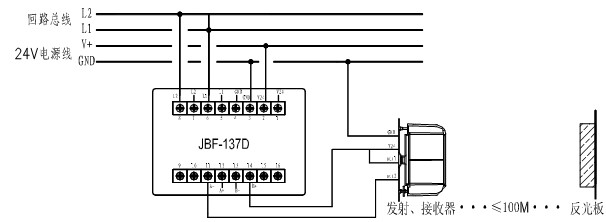 線型光束感煙探測器自身無地址編碼功能,需要配接中繼模塊 JBF-137D 接入系統;