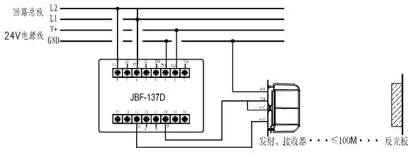 8、JBF-137D中繼模塊與 JTY-H-VDC1382A線型光束感煙探測(cè)器連接示意圖: