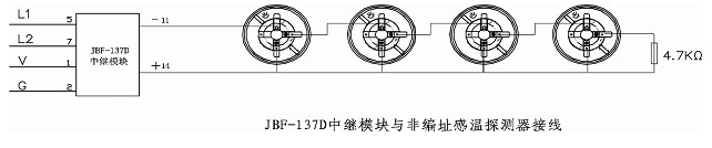 7、JBF-137D中繼模塊與非編址感溫探測(cè)器JBF-3110/C 連接示意圖: