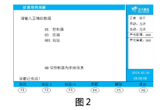 ② 按數字“2”鍵,進入設置部件屏蔽界面,輸入2位控制器地址和要屏蔽部件的2位回路、3位地址,按“屏蔽”鍵完成部件屏蔽(圖2),屏幕顯示屏蔽狀態界面。